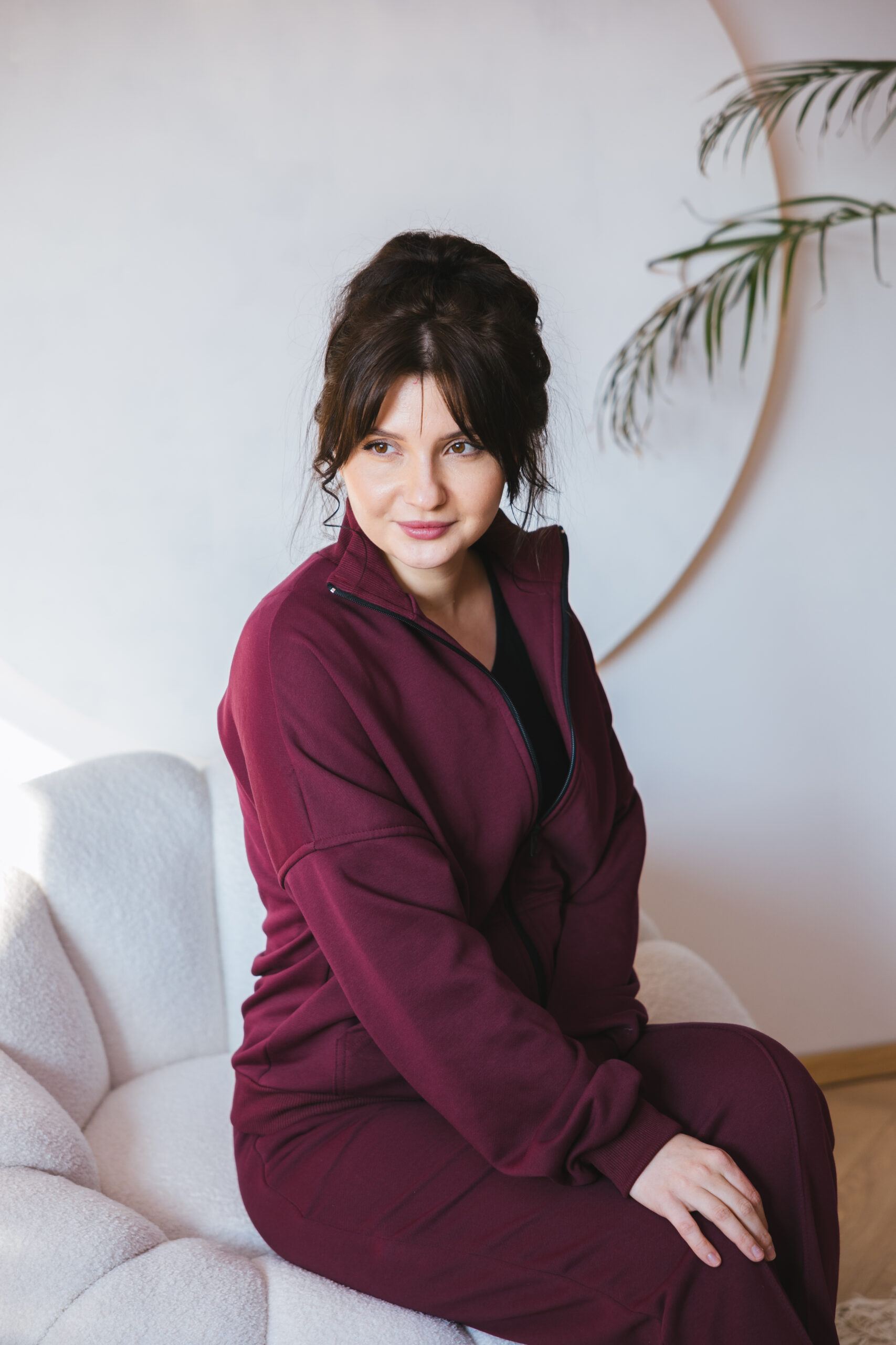 Bluza dresowa bomberka Nadine w najmodniejszym kolorze burgund. Ma luźny krój z lekko obniżoną linią ramion, a szerokie rękawy nie tylko wprowadzają nonszalancję, ale także umożliwiają noszenie cieplejszych warstw pod spodem.